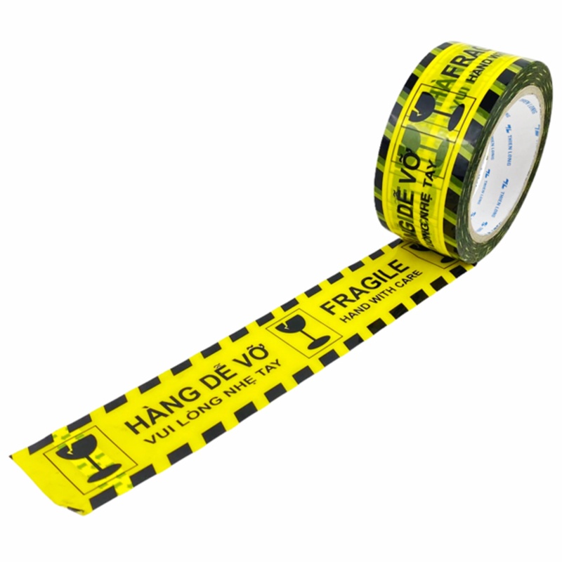 Băng keo in chữ “Hàng dễ vỡ” là loại băng keo đặc biệt được sử dụng để đóng gói, vận chuyển hàng hóa dễ vỡ. Loại băng keo này thường có màu vàng nổi bật với dòng chữ “Hàng dễ vỡ” được in rõ ràng, thu hút sự chú ý của người vận chuyển và người nhận hàng.