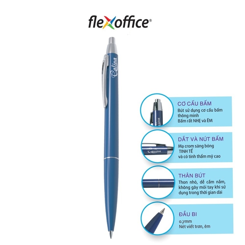 Bút bi Flexoffice FO-030 đầu viết 0.7mm, thân trong suốt, mực xanh đậm. Nét viết mượt, không lem, sử dụng lâu dài. Sản phẩm phổ biến của Flexoffice.