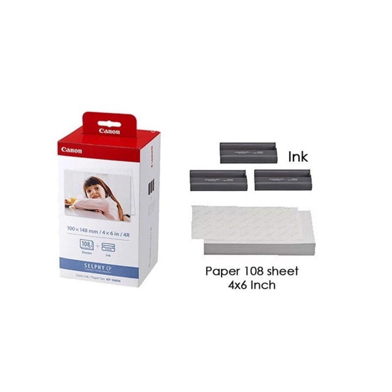 - Giấy in ảnh Canon KP-108 có kích thước 10 x 15cm: được đóng gói thành từng bộ gồm 108 tờ giấy in ảnh và mực in đi kèm.