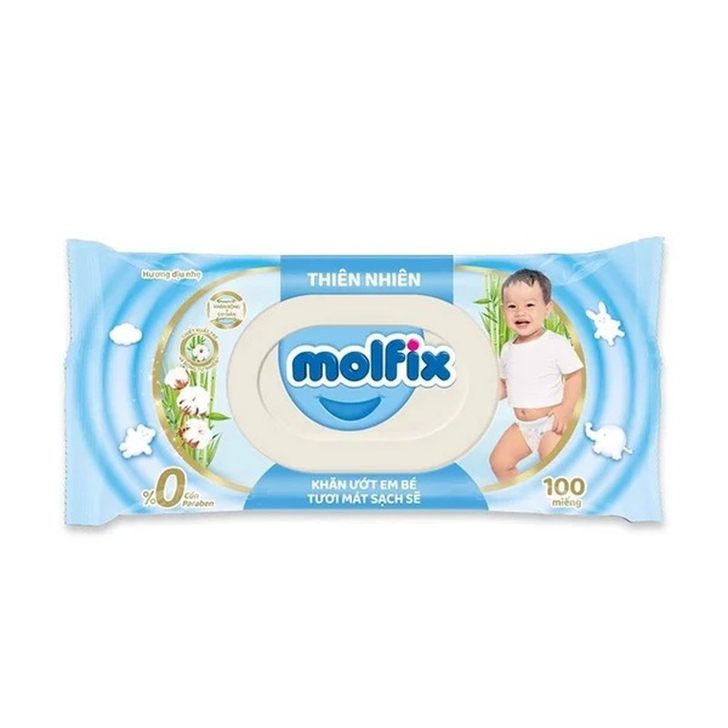 - Thành phần thiên nhiên: Khăn giấy ướt Molfix được làm từ các thành phần tự nhiên, không chứa các chất độc hại như paraben, an toàn cho làn da nhạy cảm của bé.
